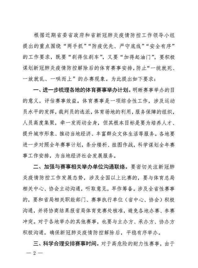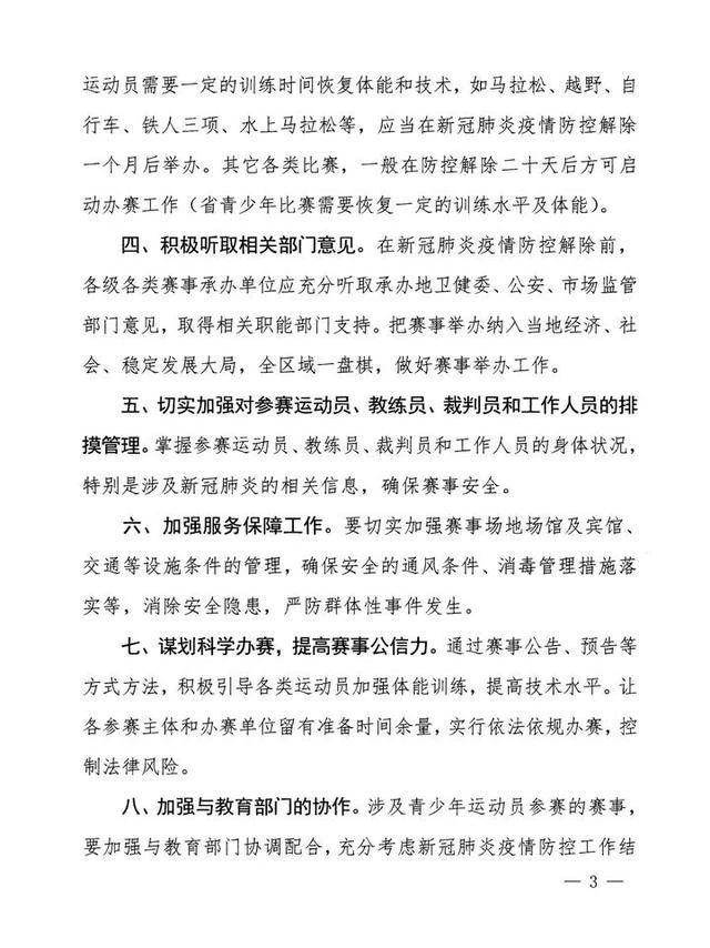 其它各类比赛,一般在防控解除二十天后方可启动办赛工作(省青少年比赛需要恢复一定的训练水平及体能)。