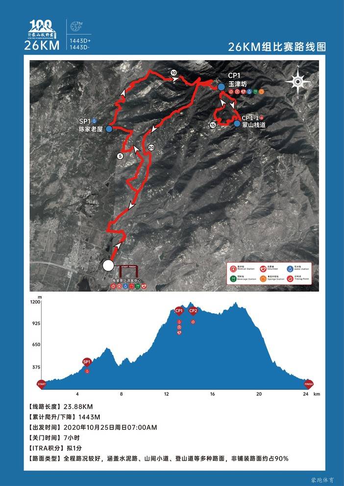 穿越蒙山国家栈道和沂蒙山美丽乡村核心景区,起点位于沂蒙山龟蒙景区服务中心,沿途设有1个补给站和1个补水站;终点位于沂蒙山龟蒙景区山顶CP1:玉津坊。