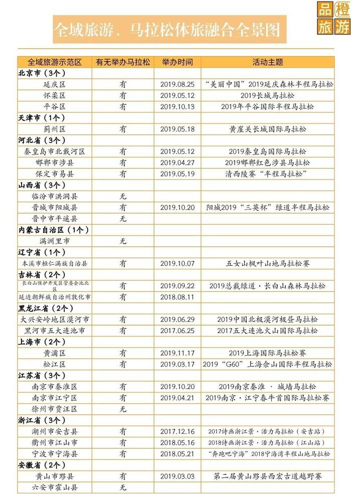 自2015年始,原国家旅游局公布两批共计500家国家全域旅游示范区创建单位,到2019年末,文化和旅游部公布首批71家全域旅游示范区,在近5年时间里,全域旅游从创建,到经历工作导则、指导意见、认定办法、验收标准、工作手册、文件解读等系列政策出台,全域旅游示范区创建验收的路径和规范越来越明晰。进入2020年,全域旅游步入常态化和机制化轨道,为文化旅游融合发展、高质量发展、高效治理,提供了更广阔的实践空间。全域旅游创建与马拉松途径路段的景观环境、公共服务设施的诸多一致性、协同性,也让体旅融合在马拉松等户外运动上,有了更坚实的发展保障。
