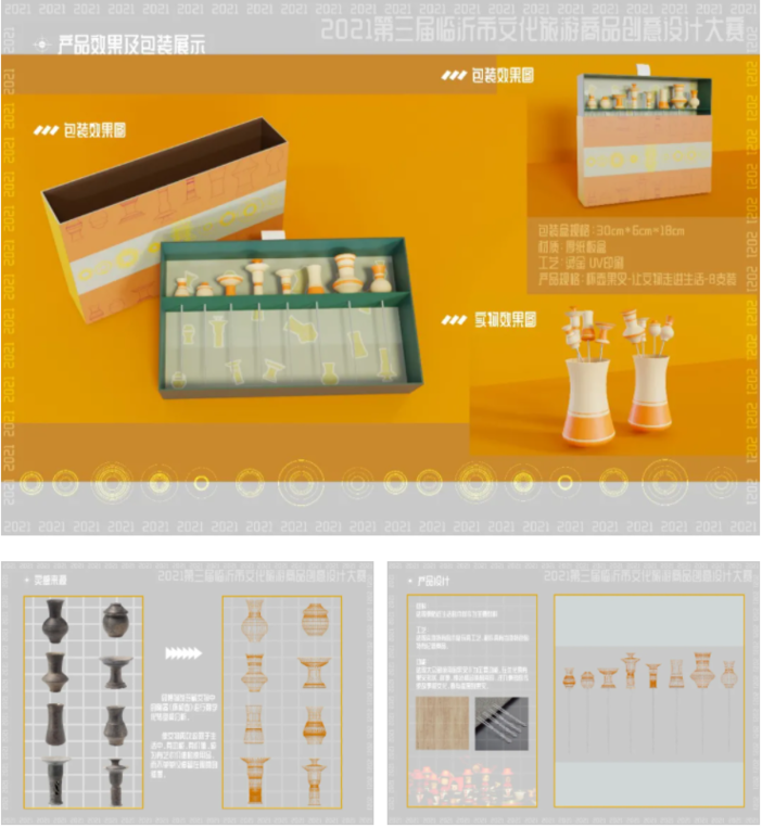 本次大赛由山东省旅游推广中心、临沂市文化和旅游局、临沂市广播电视台主办,临沂市博物馆、临沂市文化旅游发展促进中心、临沂文化旅游发展集团有限公司、融创北京区域集团青岛公司承办。大赛于2021年5月启动,历时三个月,吸引了全国各大高校、设计公司及设计爱好者的踊跃参与,共收到来自北京、江苏、山东、台湾、吉林、福建、河南等地投稿的设计类作品768件/套,实物类作品201件/套。作品种类涵盖家居生活用品、办公文化用品、工艺美术品、食品、娱乐旅游用品、生活装饰用品等多个领域。大赛评审结合文化性、创新性、市场性、审美性、实用性五个方面评审标准进行,在注重设计作品创意的同时,更加强调产品转化的可操作性。