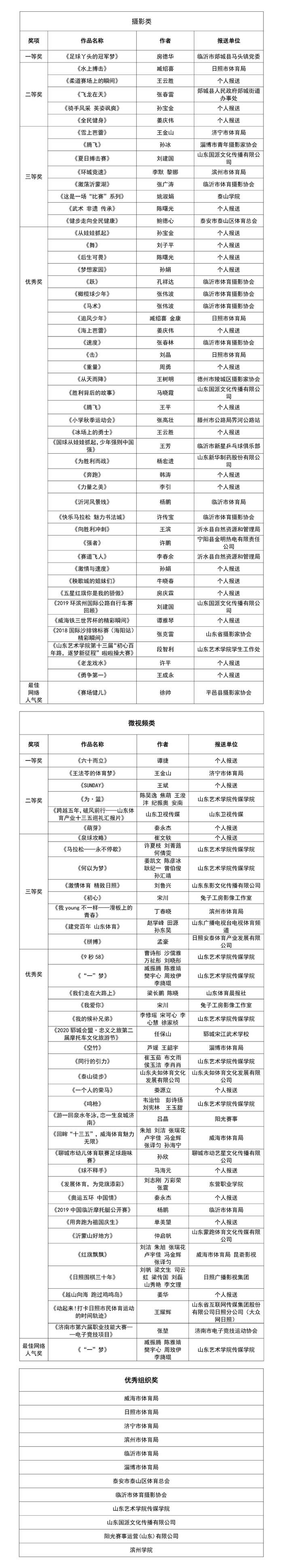 为贯彻落实2021年全省体育工作会议精神,持续加强体育文化传播阵地建设,以优异成绩庆祝中国共产党成立100周年,山东省体育局举办“中国体育彩票”山东省第二届体育影像大赛。经前期动员宣传、推荐报名、网络投票、专家评审等环节,分别评选出摄影组一等奖1名、二等奖5名、三等奖8名、优秀奖35名及最佳网络人气奖1名,微视频组一等奖1名、二等奖5名、三等奖8名、优秀奖25名及最佳网络人气奖1名,并根据各单位组织参赛情况,评选出优秀组织奖12名。