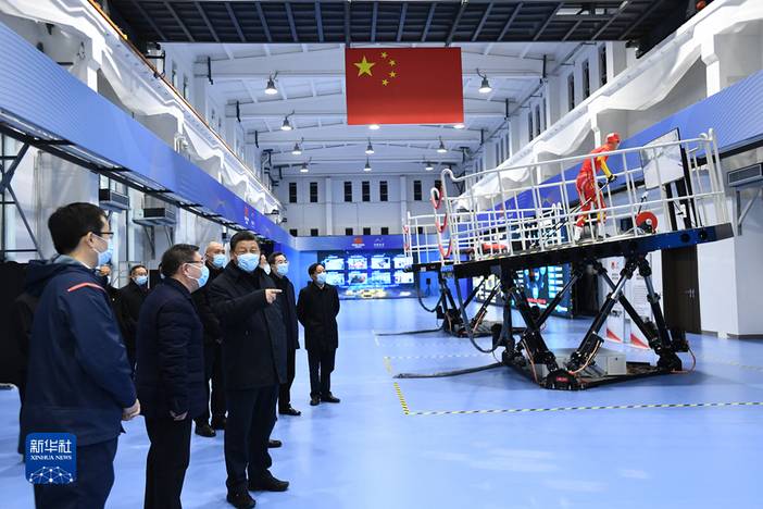 习近平总书记走进六自由度训练馆。在这里,用于训练飞行员的防晕眩训练器,也引入到了体育领域。现场介绍情况的同志讲得专业,总书记听得仔细,他十分关心冰雪运动的技术创新。