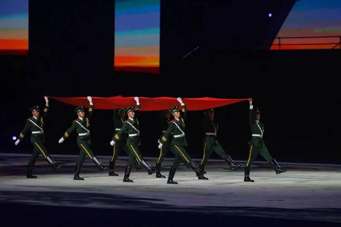 入场式后,全场起立,在雄壮的国歌声中,鲜艳的五星红旗冉冉升起,迎风飘扬。