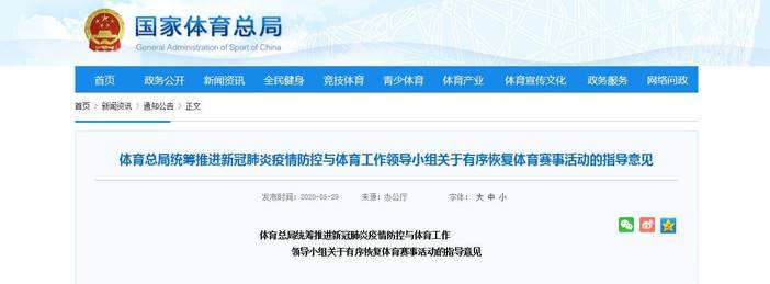 ![]() 各省、自治区、直辖市、计划单列市、新疆生产建设兵团体育局,各厅、司、局,各直属单位,中国足球协会、中国篮球协会、中国田径协会,各改革试点项目协会: 为适应疫情防控常态化要求,全面落实“外防输入、内防反弹”的总体防控策略,认真贯彻党中央、国务院关于复工复产的相关要求,审慎、安全、有序恢复体育赛事和活动,现将有关事项通知如下: 一、总体原则 (一)坚持将人民群众生命安全和身体健康放在首位,严格落实疫情防控工作各项要求。 (二)坚持属地管理原则。根据各地疫情防控工作要求,结合具体赛事特点,科学研判疫情防控风险,审慎有序推进。 (三)坚持“谁主办、谁负责”的原则。按照“一赛事一方案”的要求制定防控工作方案和应急预案。 二、具体要求 (一)采取预约、限流等方式,有序开放各类运动场所。在落实防控措施的前提下,可开展本地群众体育健身活动。全国性马拉松等人群聚集、跨区域举办的群众性体育赛事和活动暂不恢复。 (二)在充分考虑举办地疫情防控形势和要求,综合研判赛事必要性和举办风险,制定严格疫情防控工作方案及突发事件预案前提下,审慎有序举办非身体接触类全国性单项体育赛事活动。 (三)中国足球协会超级联赛、中国男子篮球职业联赛等职业体育赛事,应单独制定赛事恢复工作方案,经审核评估后实施。 (四)国际性、全国综合性体育赛事暂不恢复。 体育赛事和活动的恢复工作将根据疫情防控形势的变化,及时进行动态调整。各单位要继续通过网络、视频等多种方式,组织开展丰富多彩的体育赛事和活动,丰富人民群众体育文化生活。